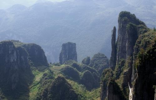 立足于黄鹤桥石林之上,近处,只见石峰秀美,形态各异,攀登黄鹤桥,就感觉自己在腾云驾雾一般,悬崖峭壁深沟暗谷云雾之间若隐若现。