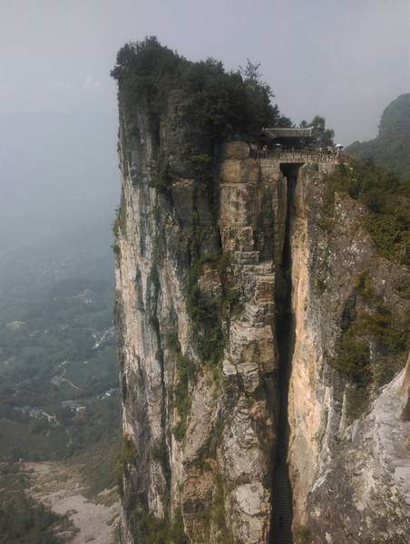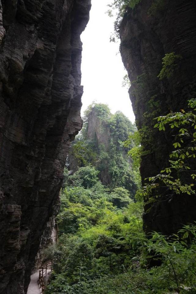此地奇峰林立,绝壁高耸,“欲与天公试比高”,绝壁间有一垂直狭缝,传说是黄鹤高飞之处,后人曾经搭桥联“天”接“地”,故名“黄鹤桥”。