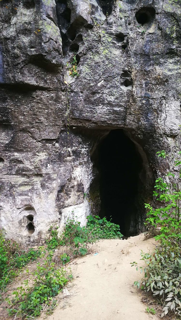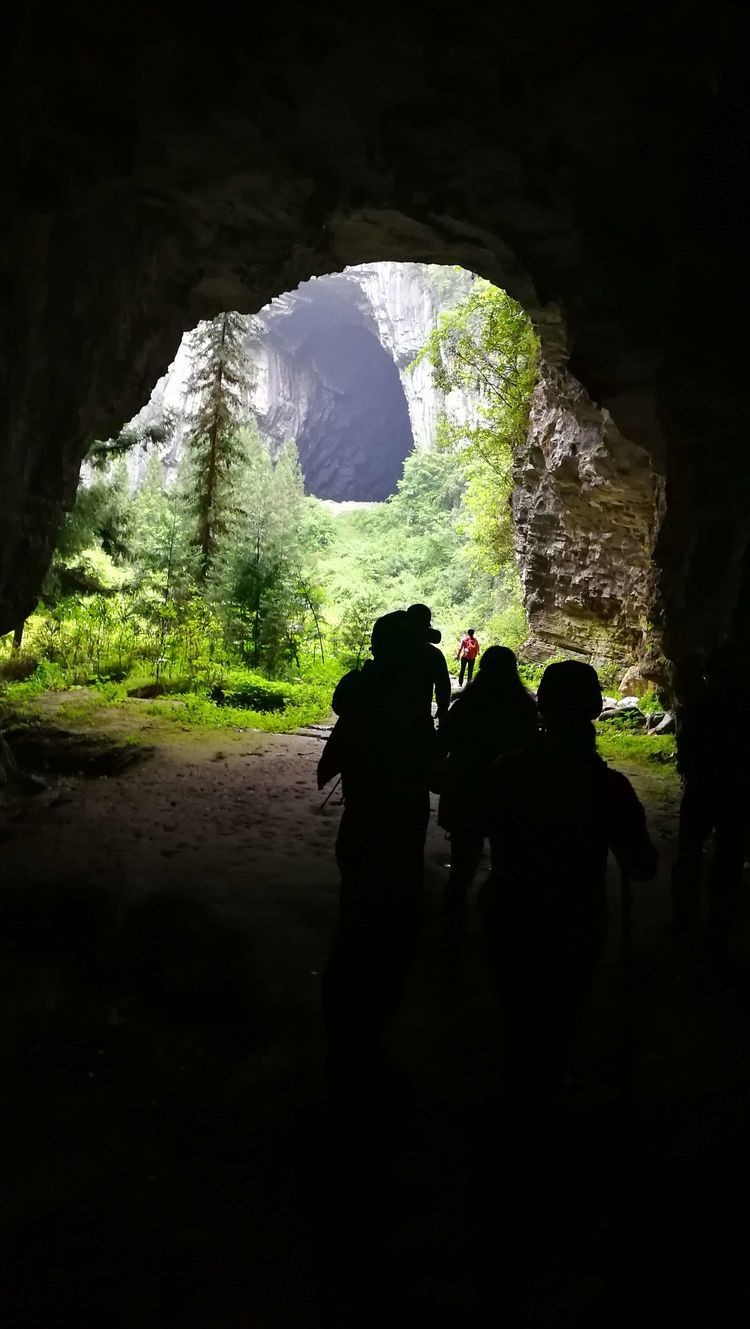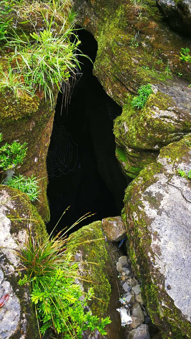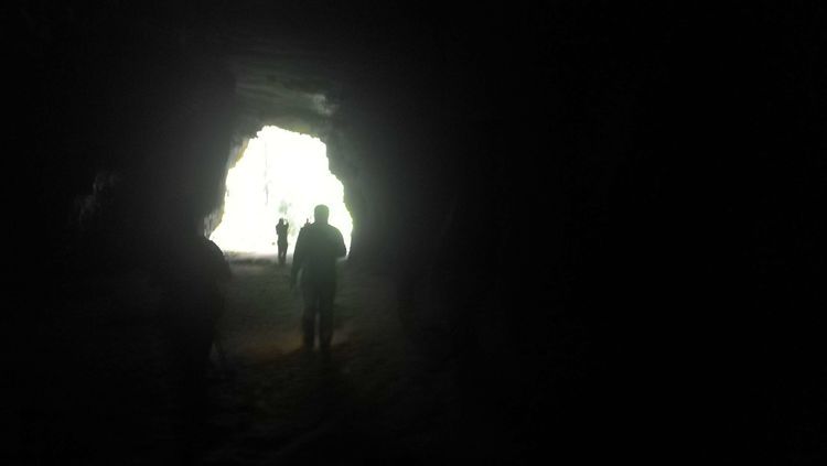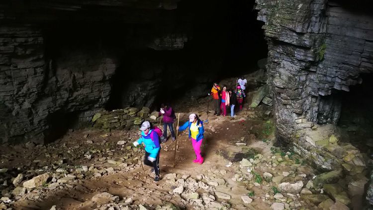 穿过一段山路,很快要进入一处山洞,山洞里漆黑一片,是真的不见五指,凉飕飕的,挺慎人,集体在洞口处打开手电筒,谁都不敢贸然前行,紧紧跟在十二哥后面,洞里地面高高低低的起伏不平,我们很谨慎的深一脚浅一脚的,在洞中穿行了大概六七分钟,才见前面一处亮光越来越大