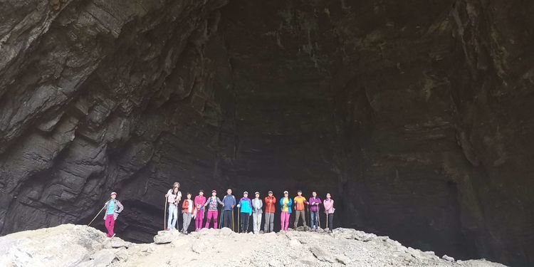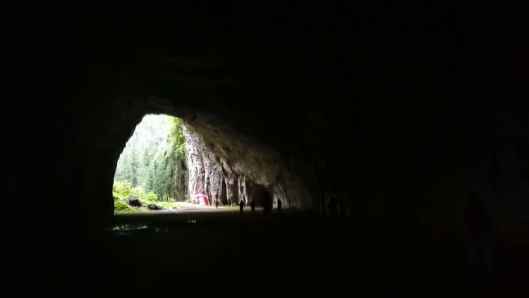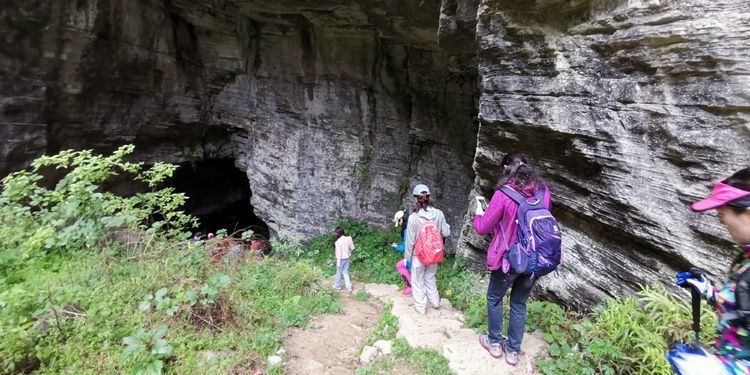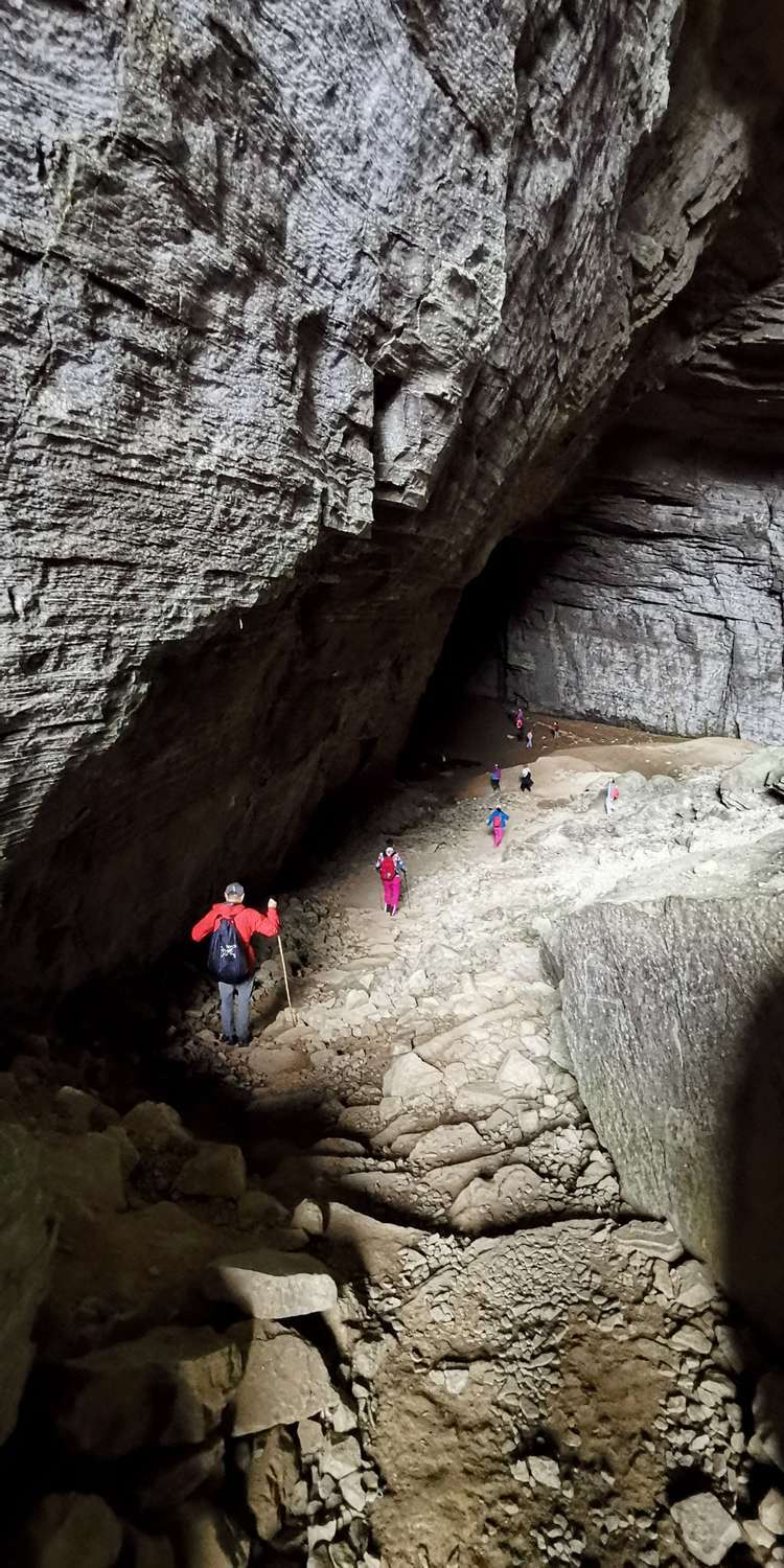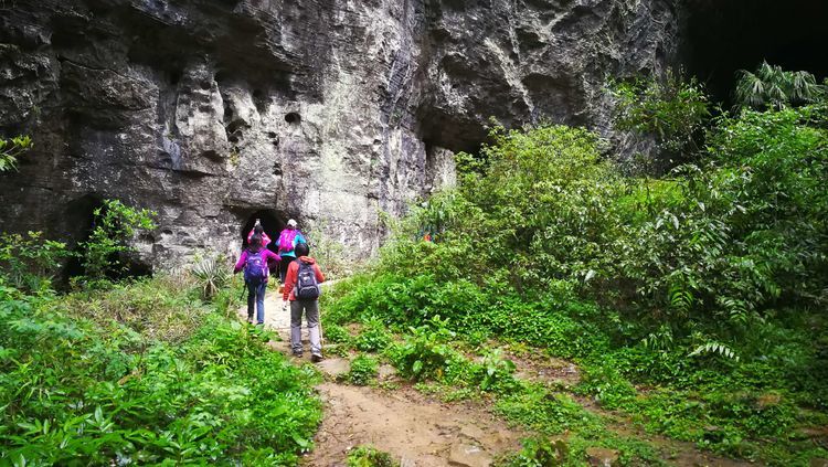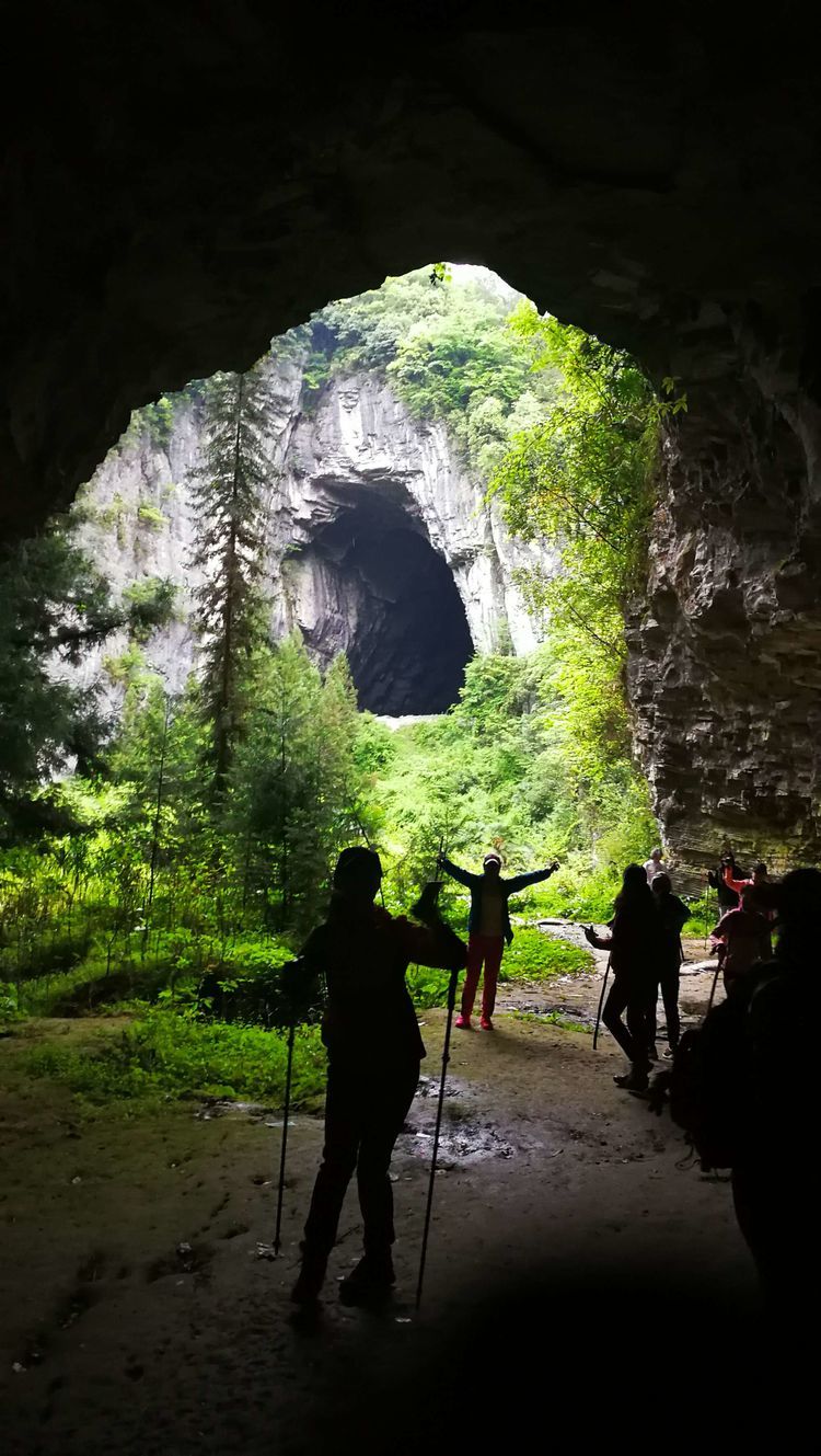 穿过一段山路,很快要进入一处山洞,山洞里漆黑一片,是真的不见五指,凉飕飕的,挺慎人,集体在洞口处打开手电筒,谁都不敢贸然前行,紧紧跟在十二哥后面,洞里地面高高低低的起伏不平,我们很谨慎的深一脚浅一脚的,在洞中穿行了大概六七分钟,才见前面一处亮光越来越大