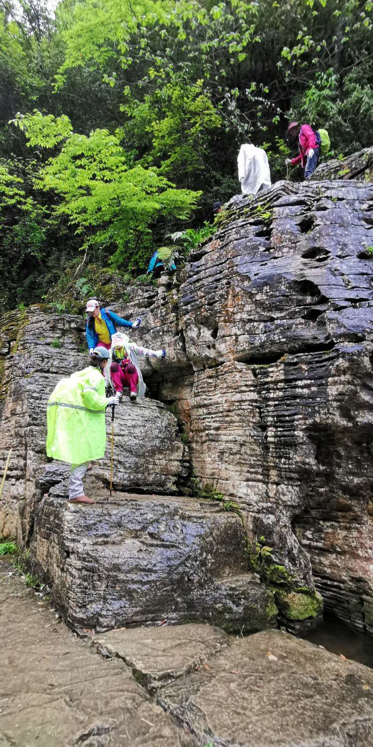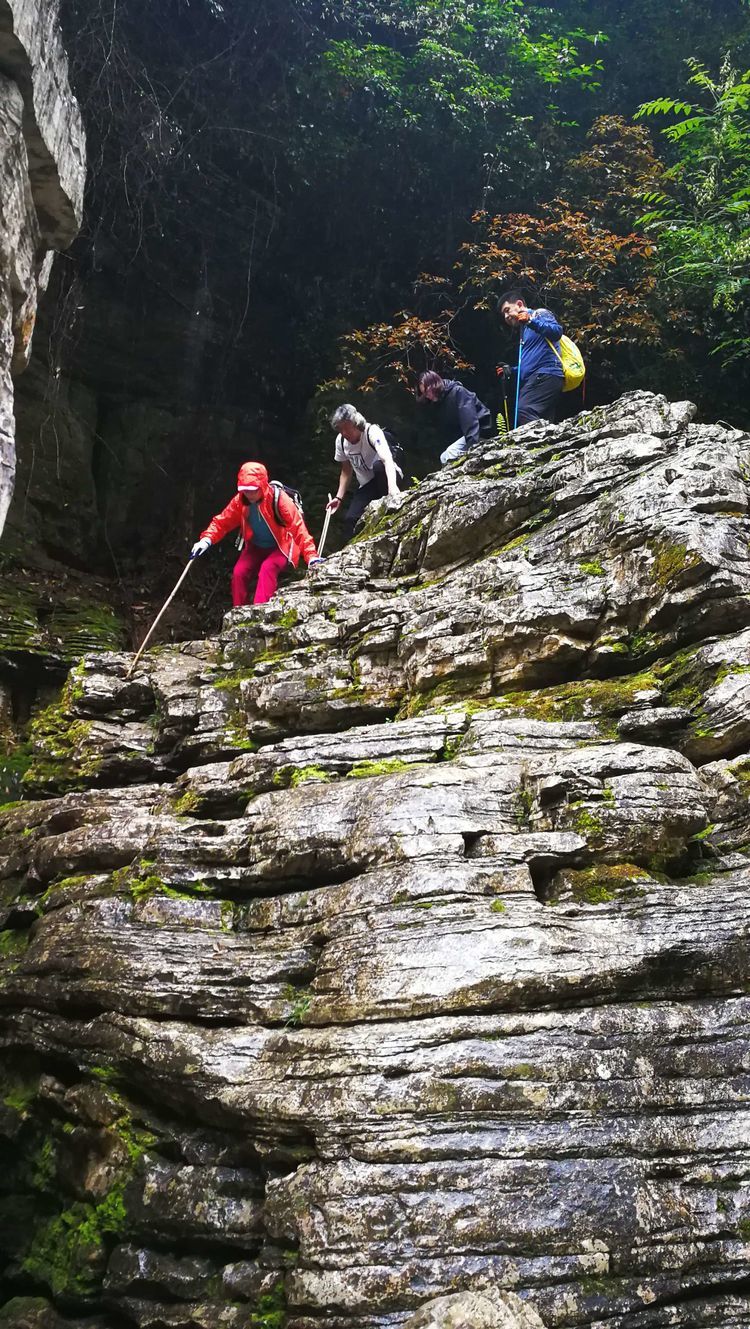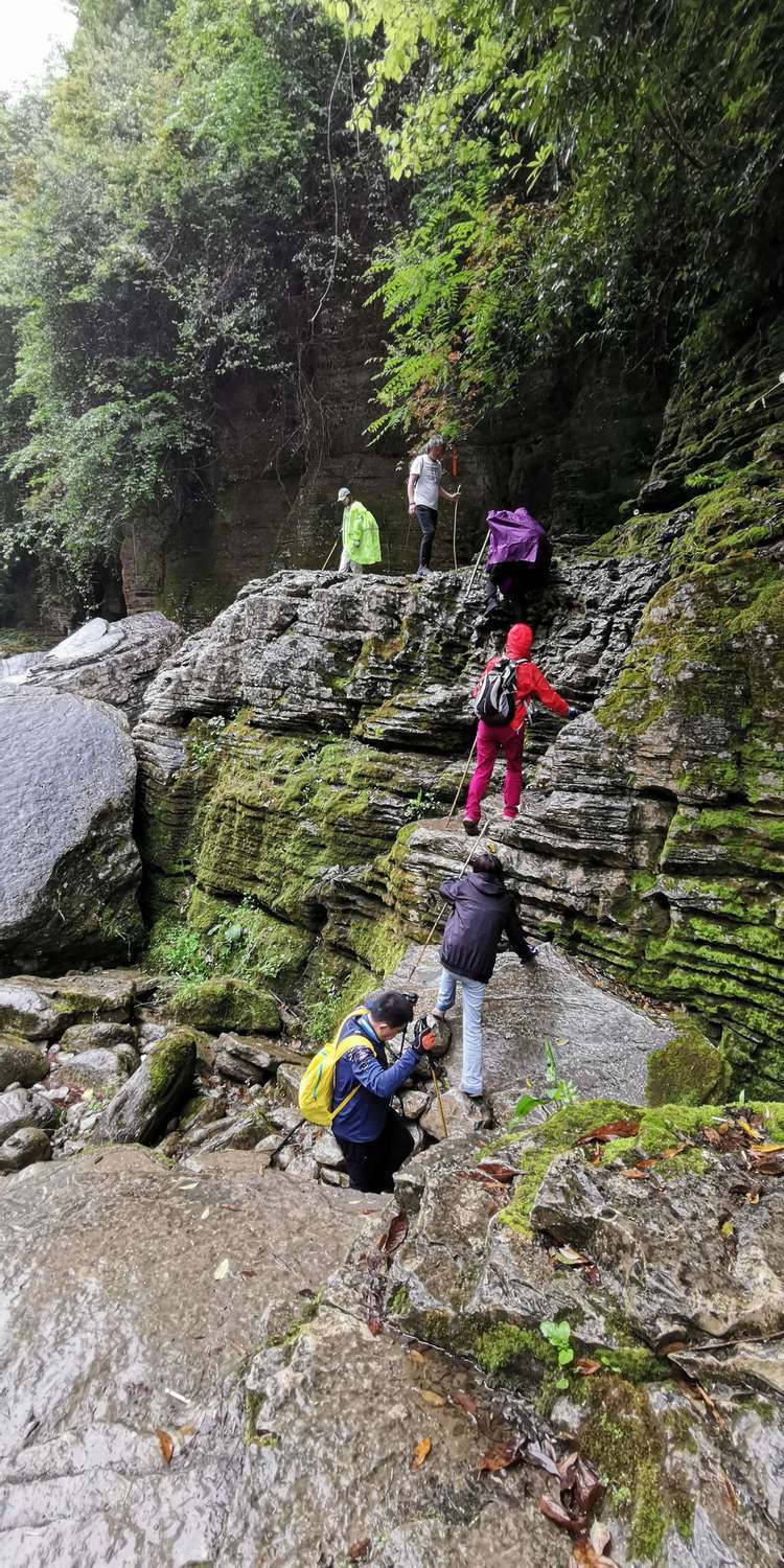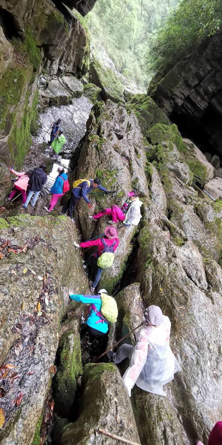 加上今天下起小雨,石头上滑溜溜的,难度可想而知,十二哥心理压力还是很大的,一直在队伍后面断后,可是队伍前面又不知道怎样走也需要引路,虽然就是沿着一个古老的河床前行,方向错不了,但是暗河洞穴随处都有,真要掉进洞穴,想要救援都没有办法,队伍里的人员也仅仅限于能够自保,救援只能等专业人员了。所以十二哥又要顾前又要顾后,大家走的战战兢兢。