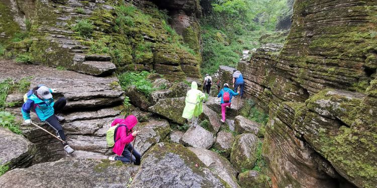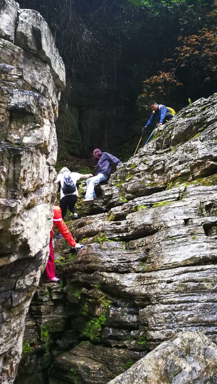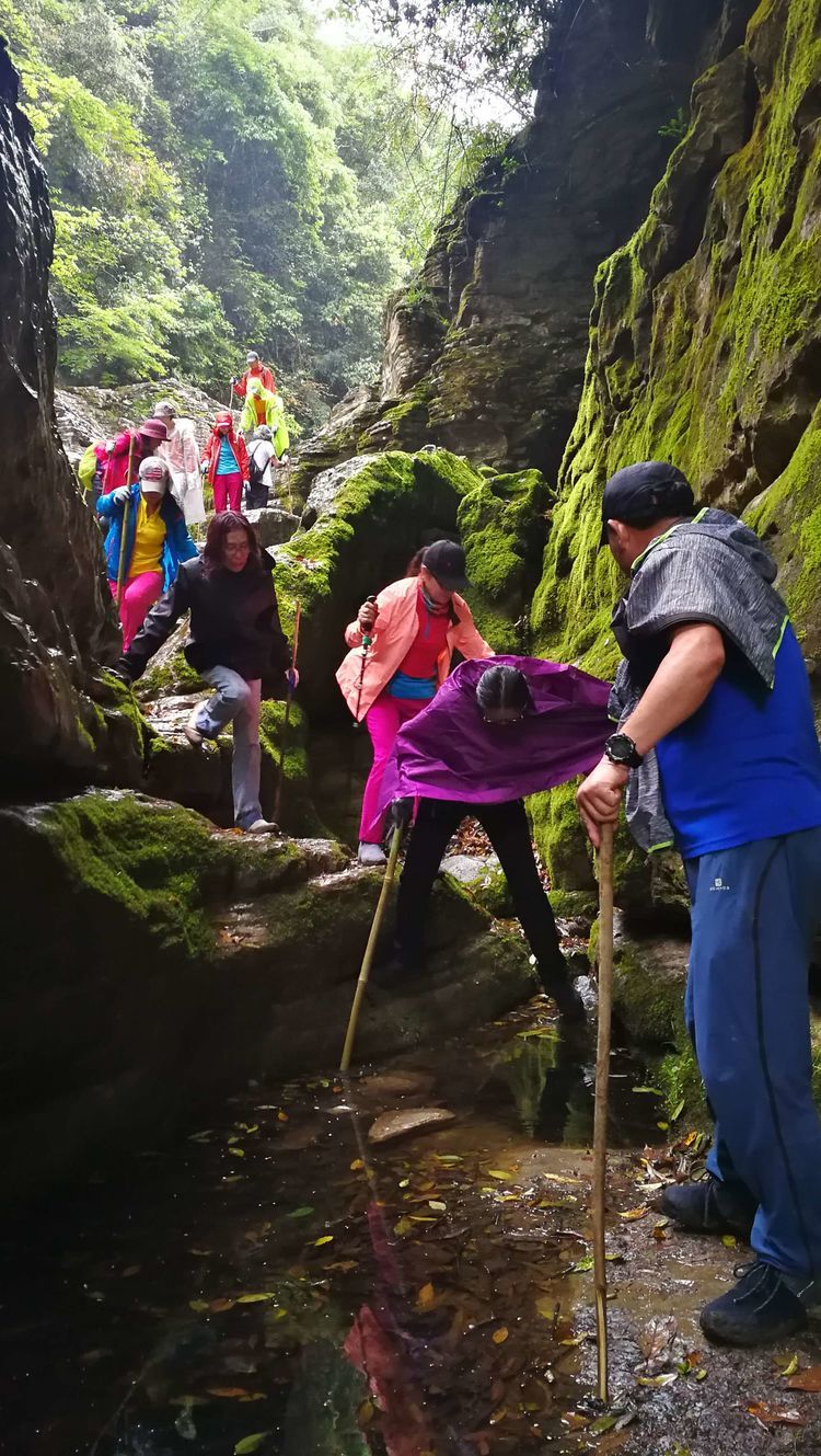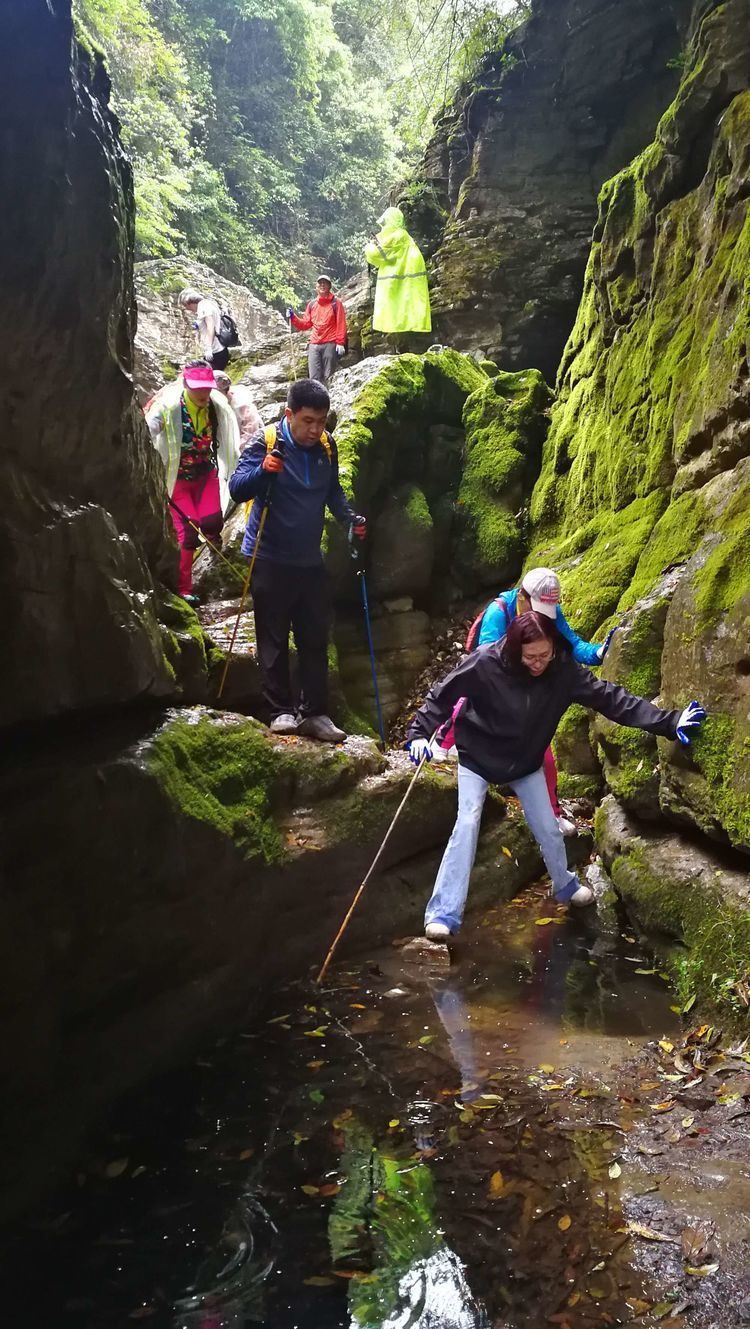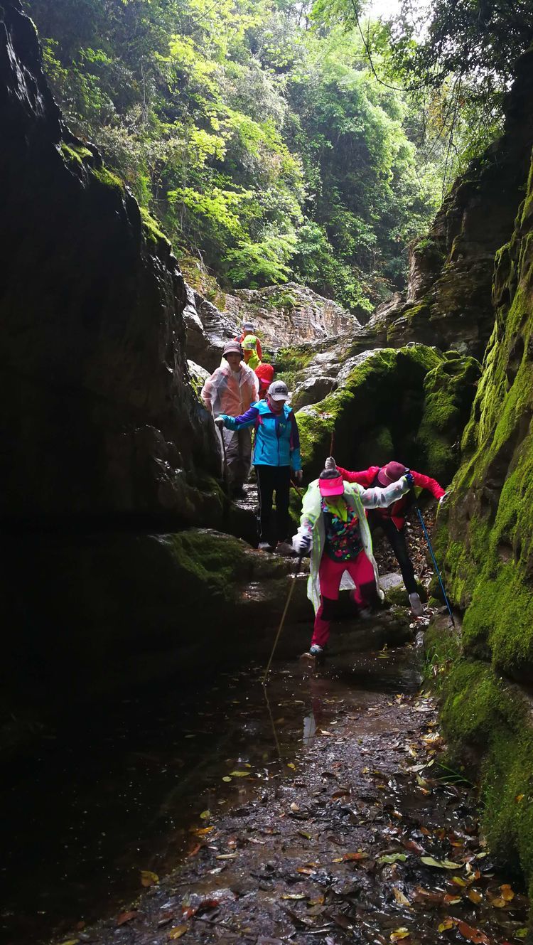 到这会儿大伙儿也不屑用什么姿势什么方式了,能用手杖借力的借力,上手攀援的攀援,用臀刹车的用臀刹,个子高腿长的自然有腿长的优势,在湿滑的岩石上下左右研究落脚点,又忐忑又有小兴奋,一时间屏气凝神默默无语各显神通,总之能顺利通过怎样都行。裴哥裴嫂虽是第一次走穿越线路,却胜在身体素质很好且都是大长腿,十二哥、达达这样经验丰富的老手却不小心踩进水沟,好在只是湿了鞋。