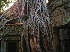 1200年前,或许那里还是一片森林,东南亚的吴哥王朝兴旺鼎盛,于是他们开始开始了一场史无前例的以至于震惊后人的浩瀚工程。砍伐了无计其数的林木,运来了大量的石料,以及后代人无法想象的工艺和技术,建筑起座座雄伟、精美的寺庙。那时的吴哥,市井繁荣,人流如织,香火旺盛,寺庙放光。时过境迁,星转斗移,犹如历史上很多强盛的王朝'最终落了个衰亡的结局。内部的固疾,外来的入侵,那曾经盛世的王朝也就过了600年,王室只能背井离乡,数百万的子民也千古之谜般的不知所踪,于是,曾经代表辉煌密布在那方热土的寺庙只能被遗弃任由自生自灭。当人离开,曾经被夷平的森林卷土重来。野草窜出地面,树苗拱出墙角,藤蔓攀爬墙壁,自然成为这个地球真正的主人,再次的统治了这里。那时恣意发挥的空间,那是无所畏惧的时光。雨水滋润了大地,阳光抚育了苗木,大树再次的参天而起,它们高大繁茂,直刺蓝天。肆无忌惮的树根,如蛇一样无孔不入。它们钻入土地
