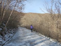 前几天还在30多度高温的福州,赤臂露腿,短裙过膝。一个航班南北跨越的时间,只是纬度的抬升,这里回到了真正的冬天。冬天应该是个什么样子的呢?如果说夏秋是绚丽多彩的,那么冬天的印象就应该是白色单一的。寒气逼人,天寒地冻,一片萧瑟,也许你的心也会变冷。那么换种心情,白雪皑皑,银装素裹,所有的都是你嬉玩欣赏的童话世界,此时你的内心或许又是火热的,因为你喜欢!此时,你会觉得冬天很美丽,雪花飞舞,晶莹剔透,雪地中打打雪仗,堆堆雪人,冰上打打陀螺滑滑冰车,冷,但玩得还是很清爽。我们就处于一个赤道南北附近人们羡慕的北纬40度以上地带!今天,我们在步云山踏行了年度辽南的第一次冰与雪。冬之步云山,些许清寒,阵风从远山掠过,蓝天下的山川绵延,远望赤山巍峨,高峰挺拔,峻冷威严,玉石水库绕伴偎依。视野中的草木已没有了过多的鲜绿装点,正还原了生命最初的本色。漫步在这寂静的山路上,蓝天、白雪、森林,溪流,冰柱相映成趣,