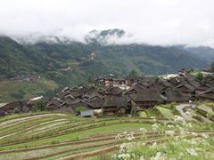 加榜梯田位于贵州省黔东南苗族侗族自治州从江县西部月亮山腹地的加榜乡东北面,距县城80公里,是中国最好梯田之一,梯田中散落着苗乡特有的吊脚楼。是苗族人世世代代留下的杰作。苗族是“稻饭鱼羹”的民族。路两侧的党扭、加页、加车、从开、平引、加榜及加车河对岸的摆别、摆党等村。加之梯田紧靠加车河,而且常年雨水充沛,无论春夏秋冬,每天清晨,一层层云雾从河边缓缓升起,慢慢的、慢慢的,这些美丽的梯连同梯田边上的苗乡吊脚楼全都被笼罩在云雾中,远远望去,那些依稀可见的吊脚楼,若隐若现,飘渺悠然,让你在陶醉中生起一种身在幻境的错觉。跟随十二哥的365户外队伍在太阳落山之前赶到了加榜梯田,落日余晖温柔的俯瞰着梯田。这里与一路走来看到的小梯田相比大的让人兴奋!苗族老阿妈的笑容很有感染力清晨,拉开窗帘的一刹那!美呆了!下了一夜的雨渐渐的停了,云雾缭绕在山谷中,形成了美妙的画卷!思嘉姐姐扛的是韭菜!这叶子超宽的大韭菜!要